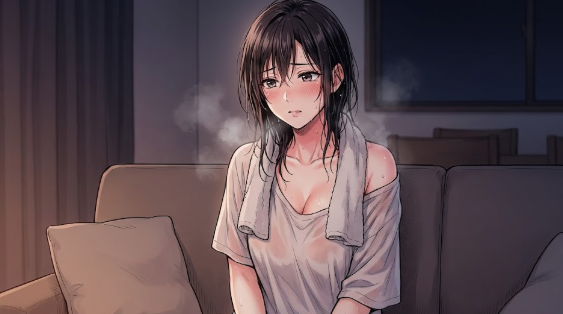 さらに、少しだけはだけた部屋着から覗く鎖骨や胸元のラインは、陸斗ならずとも目を奪われずにはいられません。